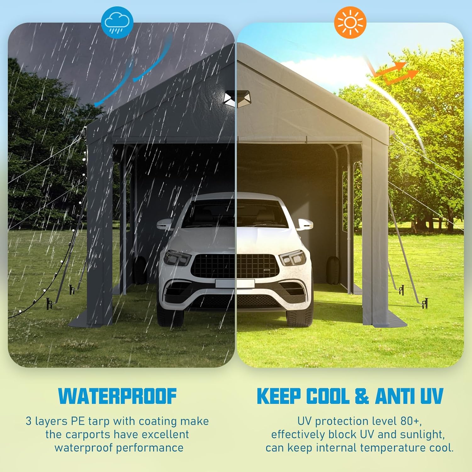 Constructed from a 1.5″ galvanized steel frame and a 180g PE canopy top, you can feel confident when strong winds come through. This carport outperforms many others on the market due to its enhanced durability that allows it to stand strong against various weather conditions.